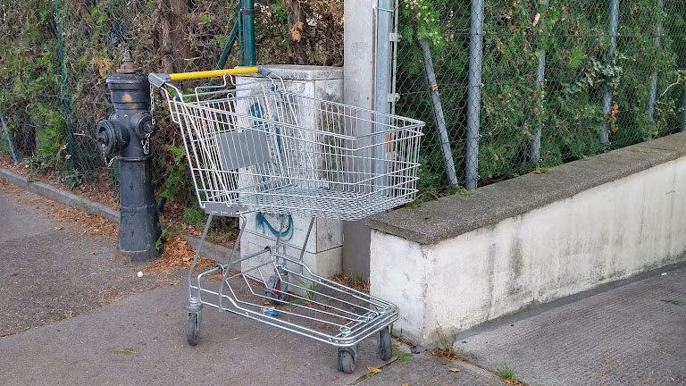 Unterdessen hatte, so will mir scheinen, der lokale Handel sich vom Präventionsparadoxon einlullen lassen und nach und nach alle Sicherungsmaßnahmen für seine Einkaufswagen aufgehoben. Sie wurden fast überall frei verfügbar, ohne Chips, ohne Münzen, ohne Grenzblockaden. Und blieben doch dort, wo sie hingehören, auf dem Areal des jeweiligen Ladens. Erstaunlich lange sogar. Seit einigen Monaten aber treiben sie sich wieder im Grätzl herum, lungern in Einfahrten, auf Gehsteigen und Grünstreifen und dienen Krähen als Sitzplatz.