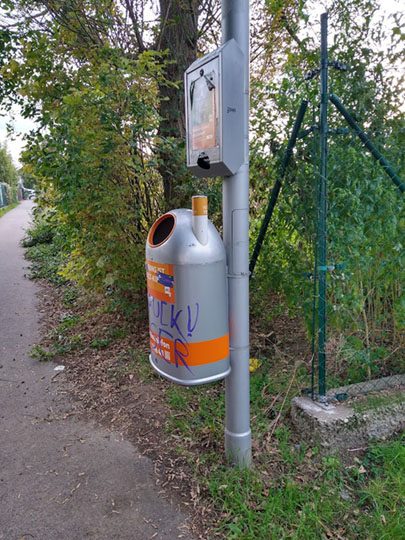 Maulen, meckern, motschgern, murren: Mein grindiges Grätzel bietet immer wieder Anlass dafür, im Großen wie im Kleinen; ringt mir aber gelegentlich auch ein anerkennendes Nicken ab: Manches funktioniert trotz stadträndischer Lage ganz ausgezeichnet. Sauberkeit im öffentlichen Raum gehört dazu, das ist nicht selbstverständlich. In Zeiten klammer Kassen sparen Kommunen auch mal an Straßenreinigung und Müllentsorgung, oder gleich an ausreichend vielen Mistkübeln. Letztere werden natürlich auch hier immer seltener, je weiter die Stadt ausfranst, und sie sind strategisch nicht immer ganz glücklich positioniert; aber es gibt sie, selbst in grünen Naherholungsbereichen. Erst recht in bebautem Gebiet, wo Menschen in größerer Zahl unterwegs sind: Wo immer sich Gassen kreuzen oder ein Bankerl auf befestigtem Untergrund steht, ist der nächste Mistkübel nah, und gewiss immer in Sichtweite. Sie werden auch fast überall und fast immer in angemessener Frequenz entleert, überquellende Mistkübel sind eine seltene Erfahrung.